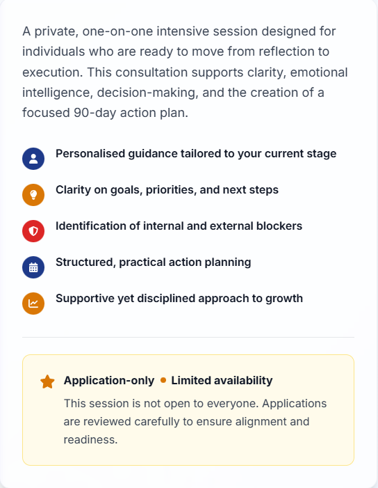 The structured approach to learning and reflection helped me realign my goals and take decisive action. I didn’t just gain knowledge — I gained direction, confidence, and a practical plan I could actually follow.